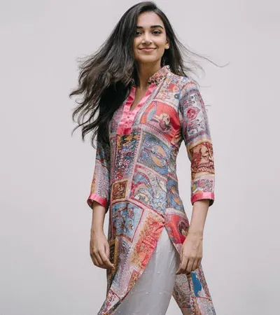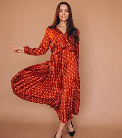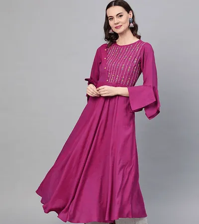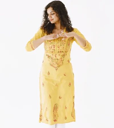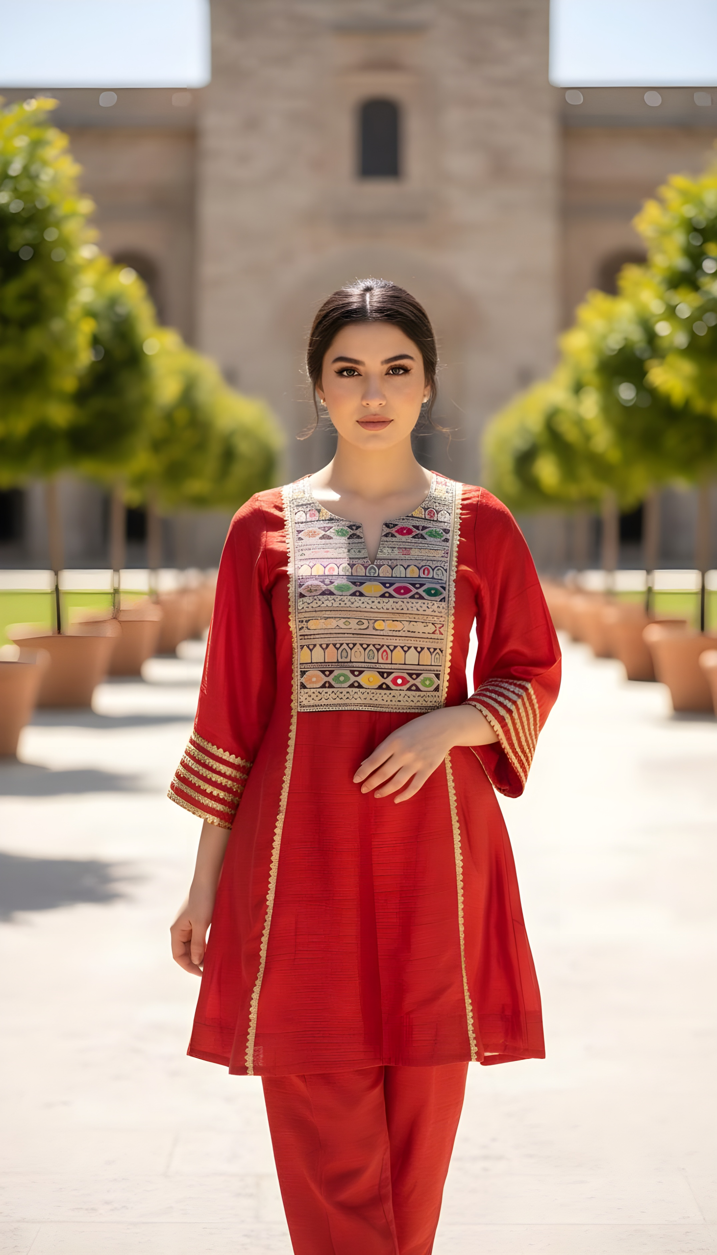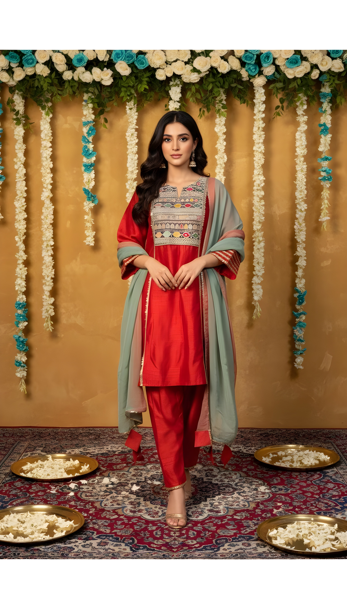 This elegant 3-piece women’s suit set features a brick-coloured short A-line kurta adorned with intricate multi-colour thread embroidery on the yoke and delicate detailing on the sleeves. It is paired with a matching brick salwar for a classic, comfortable fit. The look is completed with a dual-shade contrast dupatta blending soft green and warm coral tones, finished with subtle lace edges and tassel accents. A perfect blend of festive charm and contemporary elegance.